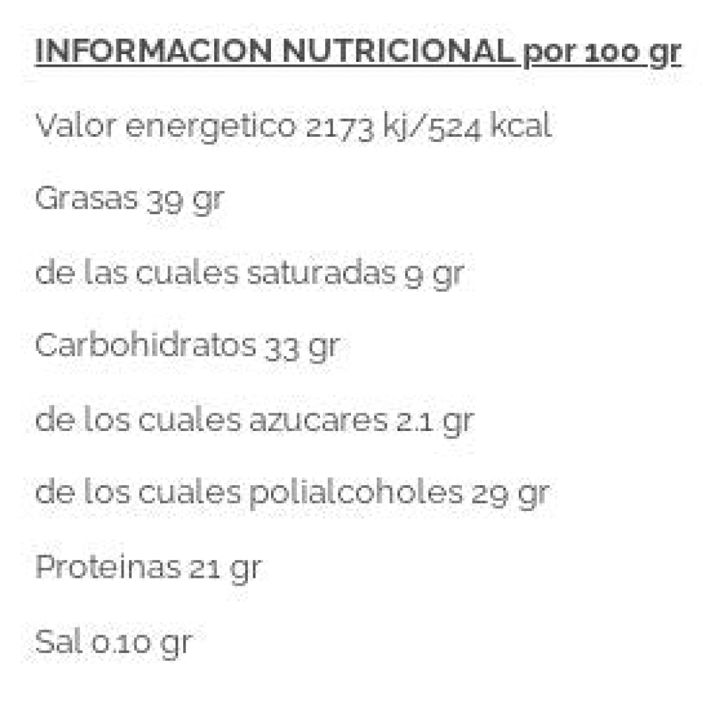 Edulcorante (Maltitol*), aceites vegetales (colza, karité y coco), concentrado de proteinas de suero de leche, (11%) avellanas, cacao (Theobroma cacao L.), desgrasado en polvo, emulsionante (lecitina de soja) y aroma