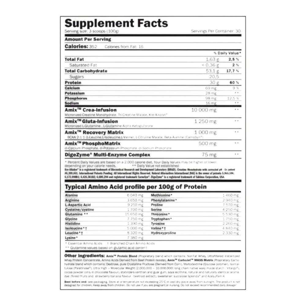 Amix™ Protein Blend (Mezcla patentada que contiene: Suero de leche sin grasa, concentrado de proteína de suero de leche, aminoácidos derivados de proteína de ternera), Amix™ CarboJet™ Mass Matrix (Mezcla exclusiva de carbohidratos que contiene dextrosa, fructosa cristalina pura (Derivado de maíz), maltodextrina (Polímeros de glucosa), isomaltulosa (Palatinose™), Almidón de Alto peso molecular (2,000,000 – 10,000,000) de cadena larga vitargo®, Amix™ Crea-Infusion (Creatina Monohidrato, Tricreatina Malato, Kre-Alkalyn®), Amix™ Gluta-Infusion (L-Glutamina Micronizada, L-Glutamina Alfa-Cetoglutarato), Amix™ Recovery Matrix (BCAA's (L-Leucina, Isoleucina, Valina), Citrulina, Beta Alanina (CarnoSyn®)), Amix™ PhosphoMatrix (Fosfato Dicálcico, Fosfato Dipotásico, Difosfato de Sodio), estabilizadores de xantano y goma guar, lecitina de soja, aroma, colorante: (Frutas del bosque y sabor fresa-banana extracto de remolacha), mezcla de enzimas digestivas patentadas digezyme® multi complejo enzimatico (Amilasa, lipasa, lactasa, celulasa, proteasa bacteriana neutra), edulcorantes: Sucralosa, splenda® y acesulfame K.