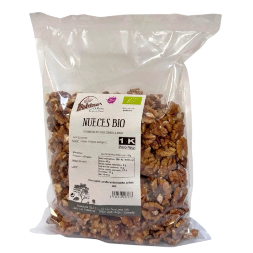 Deliciosas nueces ecológicas ya peladas y partidas por la mitad listas para tomar o para añadir a tus recetas preferidas, postres, batidos o helados.