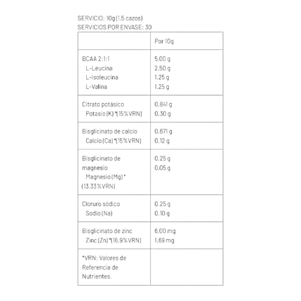 BCAA 2:1:1 (L-leucina:L-isoleucina:L-valina), acidulante: ácido cítrico, edulcorante: eritritol, aroma: natural, aroma: cola, citrato de potasio, bisglicinato de calcio, cloruro de sodio, edulcorante: sucralosa, bisglicinato de magnesio, bisglicinato de zinc, colorante: mezcla E-124/E-102/E-132. Puede contener trazas de leche, soja y gluten.