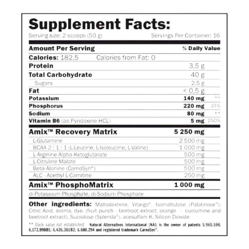 Maltodextrina (polímeros de glucosa), carbohidrato de cadena larga de cebada (almidón) de ultra alto peso molecular (500.000-700.000) Vitargo®, isomaltulosa (Palatinose®), L-glutamina, agente acidificante: ácido cítrico, fosfato de di-potasio, L-Arginina alfa-cetoglutarato, L-leucina, L-malato de citrulina, beta-alanina (CarnoSyn), fosfato de di-sodio, L-isoleucina, L-valina, acetil L-carnitina, aroma, colorante: (ponche de frutas - extracto de remolacha, naranja - curcumina y extracto de remolacha); edulcorantes: sucralosa (Splenda), acesulfamo-K; antiaglomerante: dióxido de silicio; HCl piridoxina.