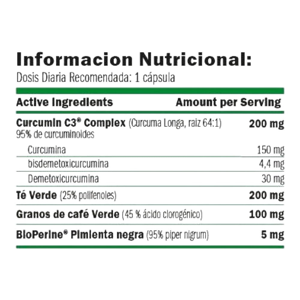 Curcumin C3® Complex (extracto de Curcuma Longa, raíz), extracto de té verde (hoja), cápsula de gelatina (gelatina pura de origen bovino, colorante: Tartracina), extracto de granos de café verde, extracto de pimienta negra BioPerine (pimienta negra,fruto),estabilizante: hidroxipropilmetilcelulosa Methocel® ;antiaglomerante: estearato de magnesio y dióxido de silicio.