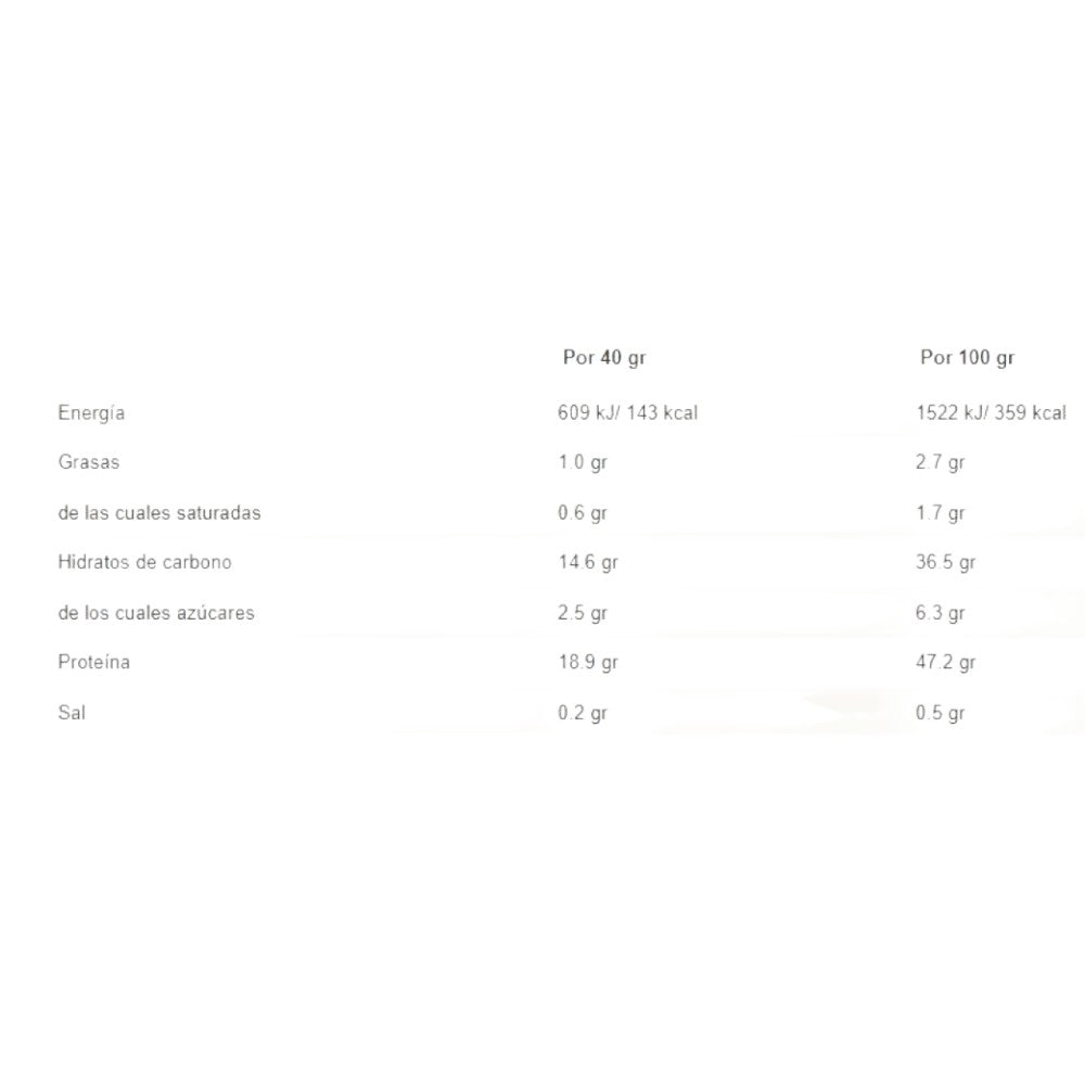 Sabor chocolate: Mezcla de proteinas Amix® 45% (aislado y concentrado de proteína de suero de leche CFM®, concentrado de proteina de la leche); harina de arroz, harina de trigo sarraceno, leche desnatada en polvo, clara de huevo en polvo, cacao en polvo, aroma, gasificante: bicarbonato sódico, cloruro sódico, edulcorante: sucralosa.