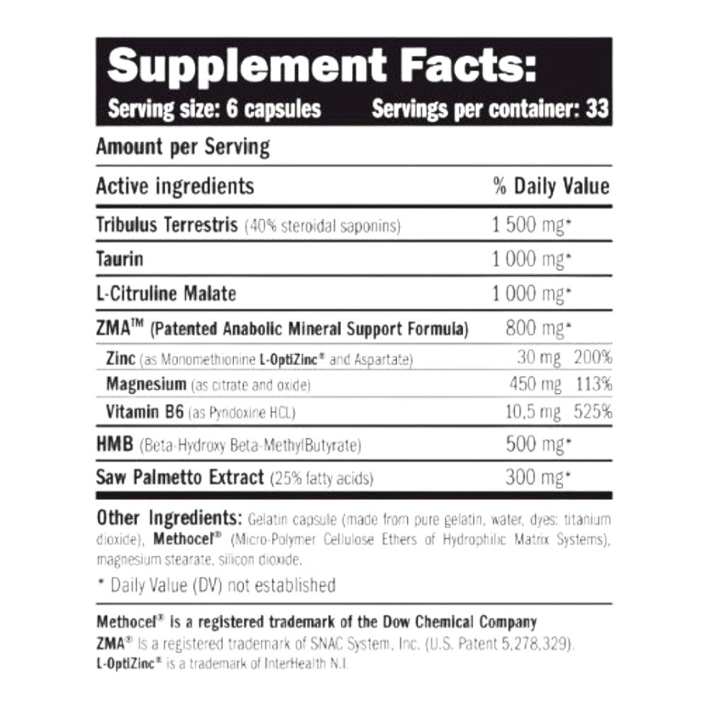 Tribulus terrestris (40% saponinas esteroides), taurina, L-malato de citrulina, ZMA® (fórmula anabólica patentada de apoyo mineral), zinc (como monometionina L-aspartato y OptiZinc®), magnesio (como citrato y óxido), vitamina B6 (como piridoxina HCl), HMB (beta-hidroxi beta-metilbutirato), extracto de Saw Palmetto (25% ácidos grasos), estabilizador: hidroxipropil metilcelulosa Methocel®, antiaglomerantes: estearato de magnesio, dióxido de silicio, cápsula de gelatina (a base de gelatina pura, agua, colorantes: Carbonato de calcio)