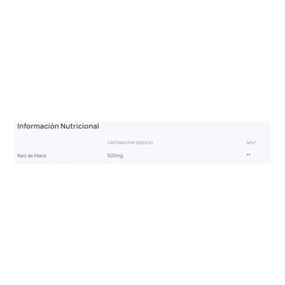 Maca (Lepidium Meyenii Walp, raíz), Cápsula vegetal (Agente de recubrimiento (hidroxipropilmetilcelulosa), Maltodextrina, Antiaglomerantes (Estearato de magnesio).