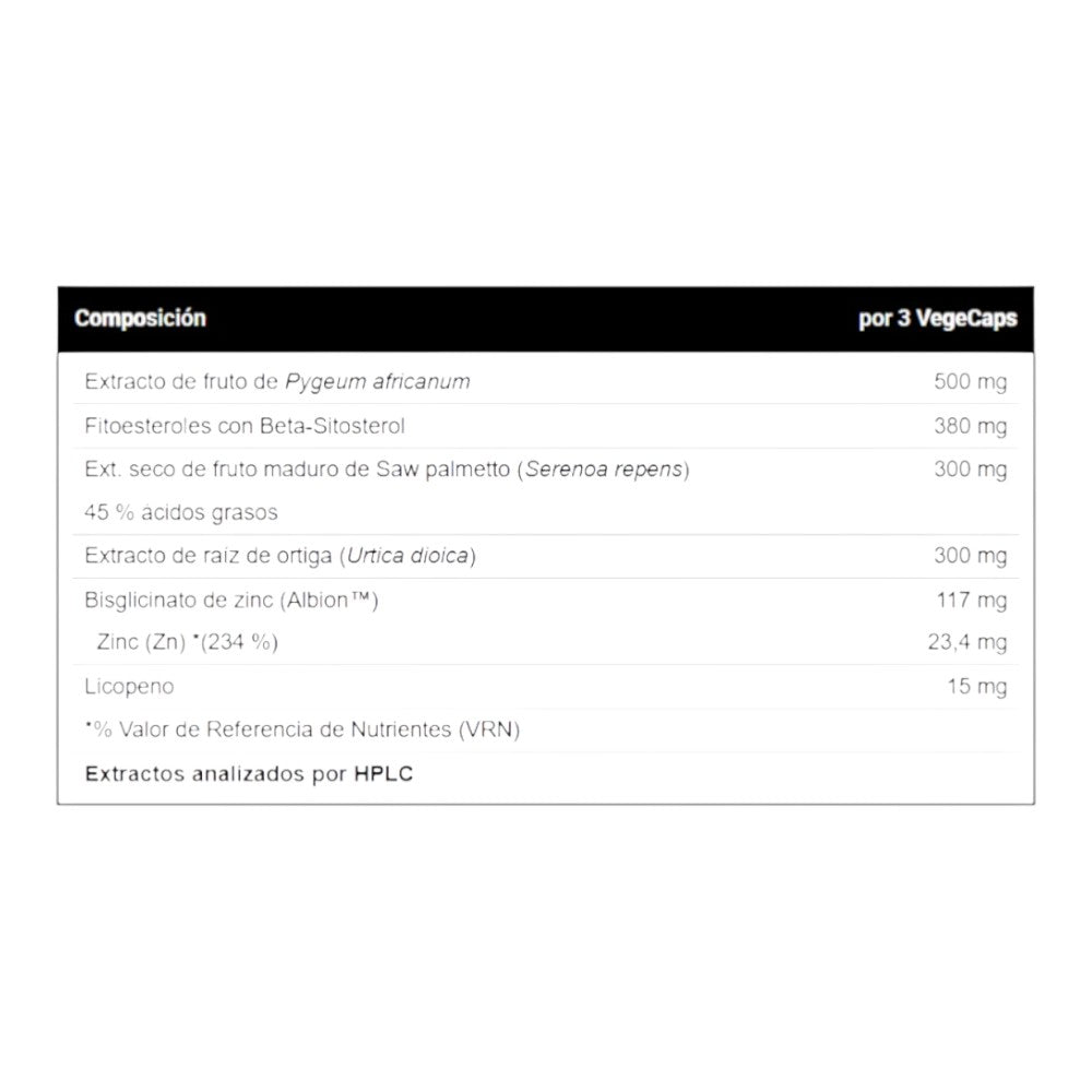Extracto de fruto de Pygeum africanum, fitoesteroles (19,15 % en 100 g de producto), espesante (cápsula): hidroxipropilmetilcelulosa, extracto seco de fruto maduro de Saw palmetto (Serenoa repens), extracto de raíz de ortiga (Urtica dioica), bisglicinato de zinc (Albion™), licopeno y antiaglomerante: sales magnésicas de ácidos grasos.