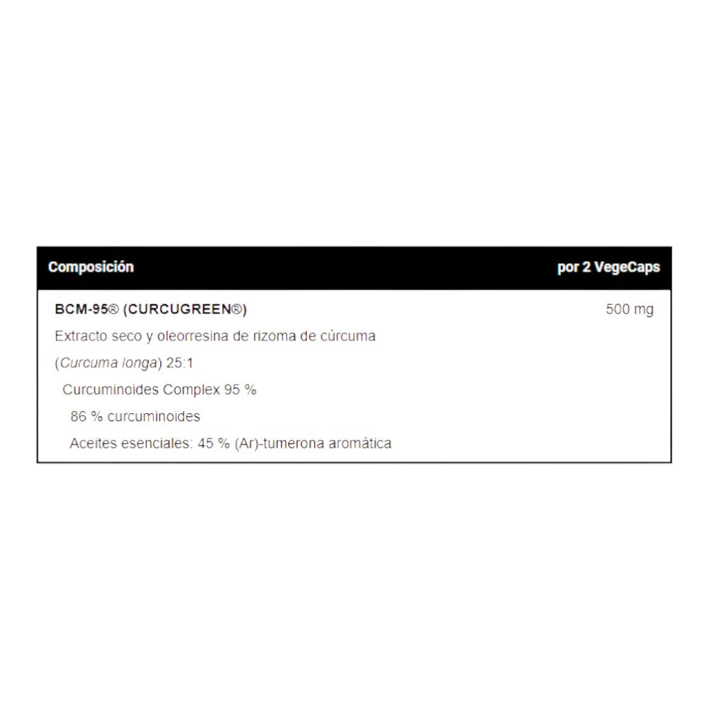 BCM-95® (CURCUGREEN®) extracto seco y oleorresina de rizoma de cúrcuma (Curcuma longa), espesante (cápsula): hidroxipropilmetilcelulosa, harina de arroz y antiaglomerante: estearato de magnesio.