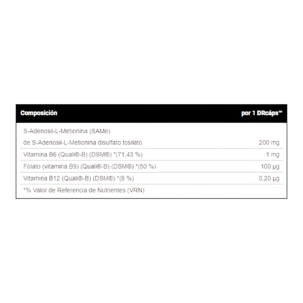 S-Adenosil metionina (SAM-e)...200.0 mg, Vitamina B9 (Ácido Fólico)...100.0 µg, Vitamina B6 (Piridoxina)...1.0 mg, Vitamina B12 (0.1% Cianocobalamina)...0.5 µg, Celulosa microcristalina (espesante), Croscarmelosa de Sodio, * Esterato de magnesio (antiaglomerante), Dióxido de silicio (Antiaglomerante) , Cápsula de gelatina.