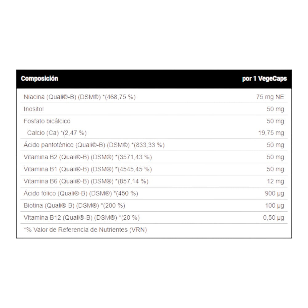 espesante (cápsula): hidroxipropilmetilcelulosa, nicotinamida (niacina) (vitamina B3) (Quali®-B) (DSM®), D-Pantotenato cálcico (ácido pantoténico) (Quali®-B) (DSM®), hidrocloruro de tiamina (vitamina B1) (Quali®-B) (DSM®), riboflavina (vitamina B2) (Quali®-B) (DSM®), inositol, fosfato bicálcico, agente de carga: celulosa microcristalina, hidrocloruro de piridoxina (vitamina B6) (Quali®-B) (DSM®), antiaglomerantes: estearato de magnesio y dióxido de silicio, harina de arroz, ácido pteroilmonoglutámico (ácido fólico) (vitamina B9) (Quali®-B) (DSM®), cianocobalamina (vitamina B12) (Quali®-B) (DSM®) y D-Biotina (biotina) (Quali®-B) (DSM®).