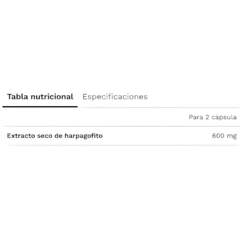Extracto seco Harpagófito (Raíz) (Harpagophytum procumbens DC, Ratio 5:1, Harpagósidos 5%) 600 mg, Agente de carga (Celulosa microcristalina) , Agente de recubrimiento (Hidroxipropilmetilcelulosa) , Agente de carga (Sal magnésica de ácido graso), Antiaglomerante (Dióxido de silicio).
