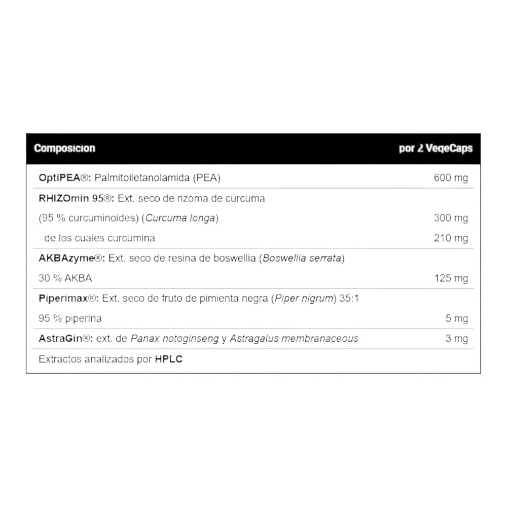 OptiPEA®: palmitoiletanolamida (PEA), RHIZOmin 95®: extracto seco de rizoma de cúrcuma (Curcuma longa), espesante (cápsula): hidroxipropilmetilcelulosa, antiaglomerante: talco, AKBAzyme®: extracto seco de resina de boswellia (Boswellia serrata), antiaglomerante: dióxido de silicio, Piperimax®: extracto seco de fruto de pimienta negra (Piper nigrum), antiaglomerante: sales magnésicas de ácidos grasos y AstraGin®: extracto de Panax notoginseng y Astragalus membranaceous.