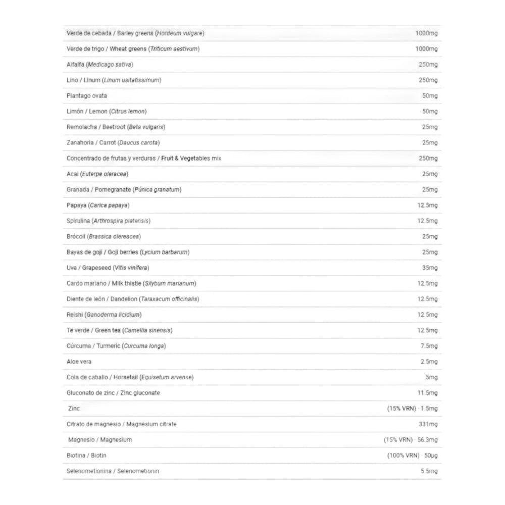 Polidextrosa, Verdes de cebada (Hordeum vulgare) y trigo (Triticum aestivum), Citrato de magnesio (17% magnesio), Alfalfa (Medicago sativa), Semillas de lino (Linum usitatissimum), Concentrado de frutas y verduras: (pimiento, jengibre, brócoli, espinacas, col rizada, col, té verde, frambuesa, plátano, kiwi, mango, ciruela, lima, arándano, piña, naranja, pomelo rosa, cereza, limón, coliflor, hierba de trigo, alfalfa, espirulina, chlorella), Inulina y oligofructosa, Plantago ovata, Limón (Citrus limonun), Semilla de uva (Vitis vinífera), Remolacha (Beta vulgaris), Zanahoria (Daucus carota), Acai (Euterpe oleracea), Granada (Púnica granatum), Brócoli (Brassica oleracea), Goji (Lycium barbarum), Papaya (Carica papaya), Spirulina (Arthrospira platensis), Té verde (Camellia sinensis), Cardo mariano (Silybum marianum), Diente de león (Taraxacum officinalis), Reishi (Ganoderma licidium), Gluconato de zinc (13% zinc), Cúrcuma (Curcuma longa), Selenometionina, Cola de caballo (Equisetum arvense), Aloe vera, Biotina (D-Biotina).