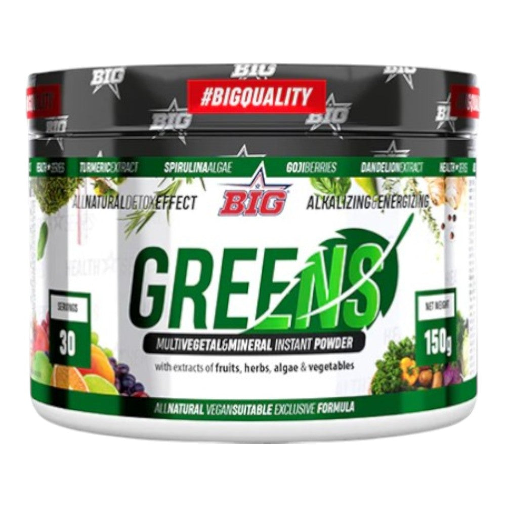 GREENS de BIG® es una combinación de más de 50 extractos vegetales y minerales enfocada a la desintoxicación y normalización de nuestro sistema digestivo. Los elementos vegetales presentes en la formulación contienen fruta variada, verduras, extractos de hierbas, algas y verdes de cereales como el trigo, la cebada o la alfalfa.Entre los compuestos minerales encontramos zinc, magnesio o selenio, indispensables para el mantenimiento del sistema inmunológico y del tracto digestivo entre otras muchas cualidades, y cubriendo en muchos casos el 100% de la cantidad diaria recomendada para un adulto en la dosis indicada.