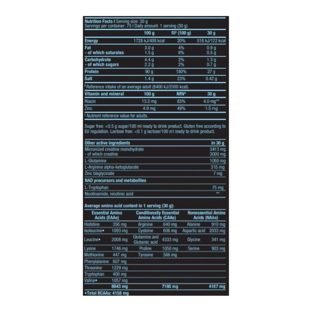 Sabor a vainilla (vanilla): aislado de proteína de suero de leche 77% [aislado de proteína de suero de leche, emulgente: lecitinas (soja)], monohidrato de creatina micronizado 11,4%, L-glutamina, aromas, potenciador de cremosidad [aceite de coco parcialmente hidrogenado, leche desnatada en polvo, emulgentes (E471, E472a), jarabe de glucosa, sacarosa, proteína de leche, estabilizante (fosfatos de potasio), antiaglomerante (fosfatos de calcio)], L-arginina alfa-cetoglutarato, emulgente: lecitinas (soja), espesantes (carragenanos, goma xantana), sal, antiaglomerante (dióxido de silicio), L-triptófano, edulcorante (sucralosa), bisglicinato de zinc, nicotinamida, ácido nicotínico, colorante (tartrazina)⁴.