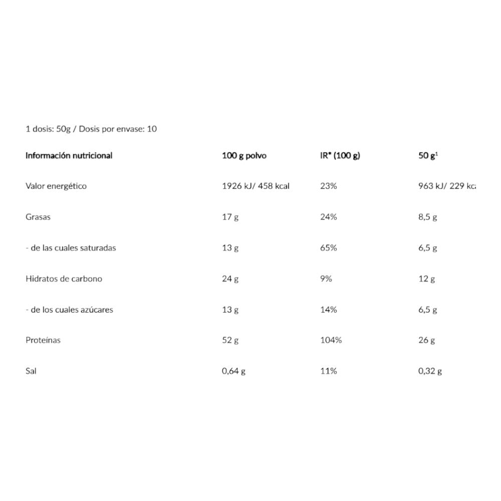 Concentrado de proteína de suero de leche, potenciador de cremosidad [aceite de coco parcialmente hidrogenado, leche desnatada en polvo, emulgentes (E471, E472a), jarabe de glucosa, sacarosa, proteína de leche, estabilizante (fosfatos de potasio), antiaglomerante (fosfatos de calcio)], leche entera en polvo, cacao en polvo bajo en grasa, aromas, espesante (goma xantana), sal, edulcorante (sucralosa).