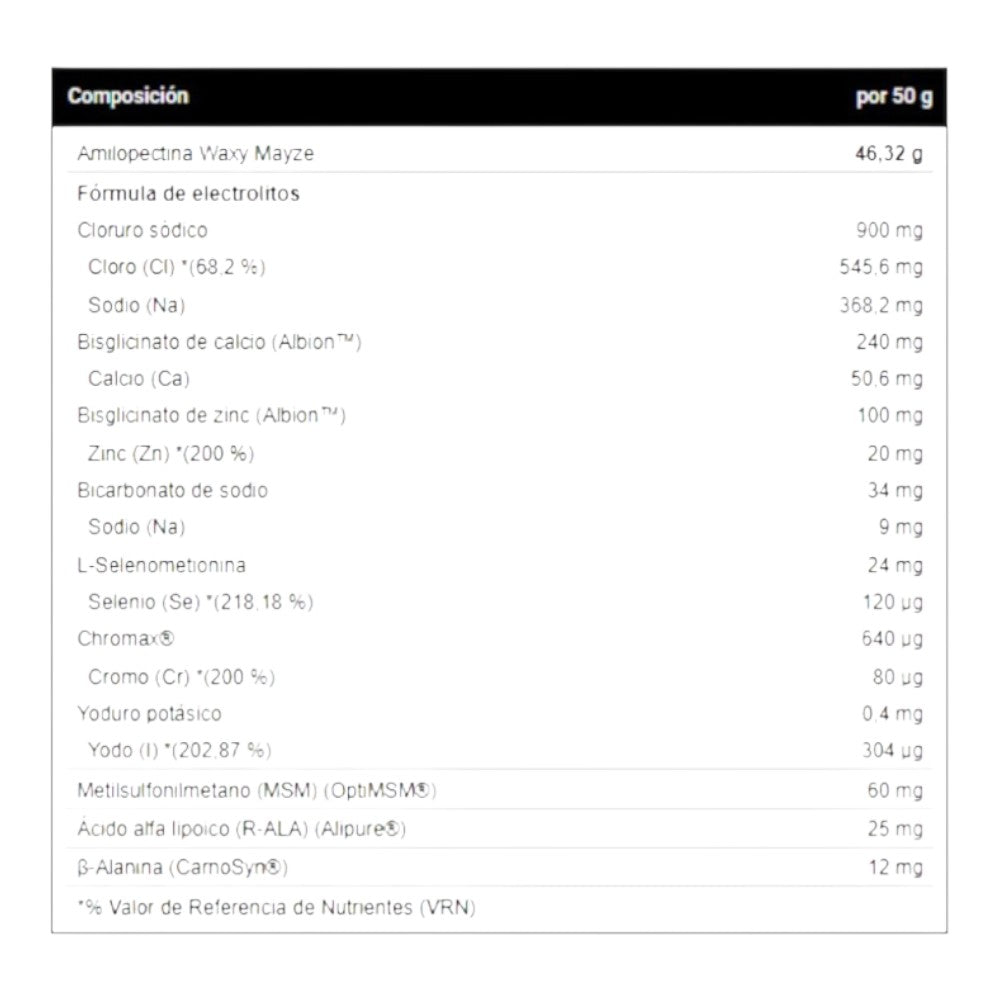 amilopectina Waxy Mayze (sulfitos), acidulante: ácido cítrico anhidro, cloruro sódico, aroma: piña, bisglicinato de calcio (Albion™), bisglicinato de zinc (Albion™), edulcorante: sucralosa, aroma: naranja, metilsulfonilmetano (MSM) (OptiMSM®), bicarbonato de sodio, ácido alfa lipoico (R-ALA) (Alipure®), L-Selenometionina, β-Alanina (CarnoSyn®), Chromax®: picolinato de cromo 1:10, colorante: E-133 y yoduro potásico.