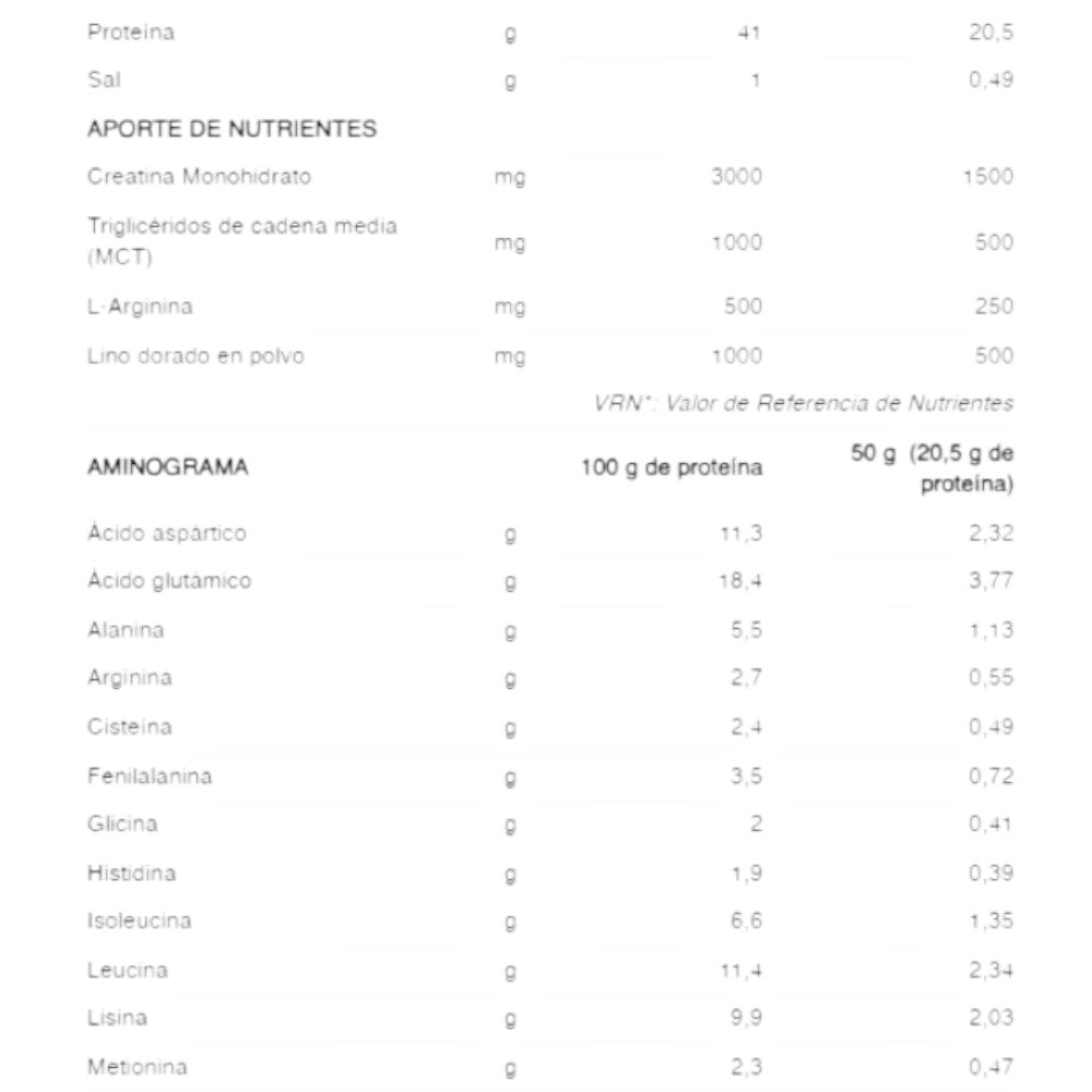 Concentrado de proteína de suero Grass fed (leche, lecitina de soja), almidón de patata, cacao en polvo bajo en grasa, creatina monohidrato, aroma, triglicéridos de cadena media (MCT) en polvo, semillas de lino dorado (Linum usitatissimum, semilla), espesantes (goma guar y goma xantana), L-arginina AKG, cloruro de sodio, edulcorante (sucralosa).