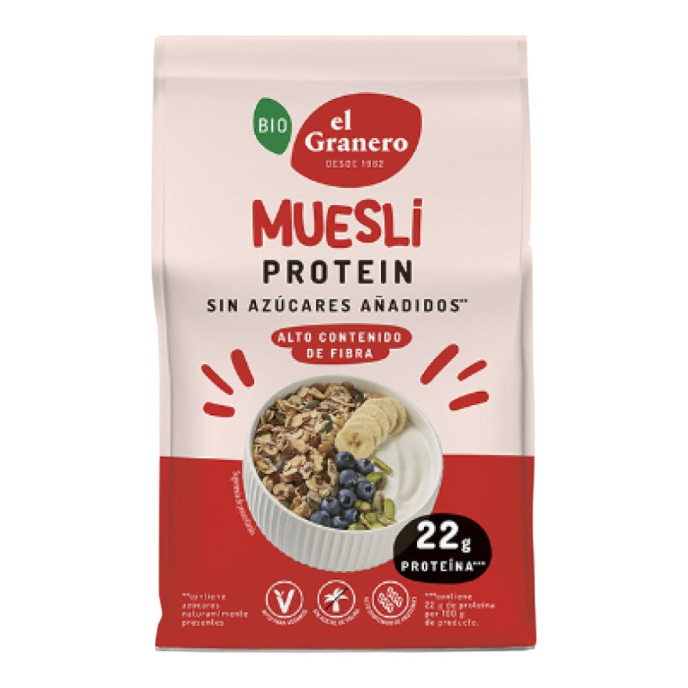 Muesli Protein Bio de El Granero Integral es un producto de cultivo ecológico ideal para usar como cereal de desayuno o para añadir a yogures o cremas.
