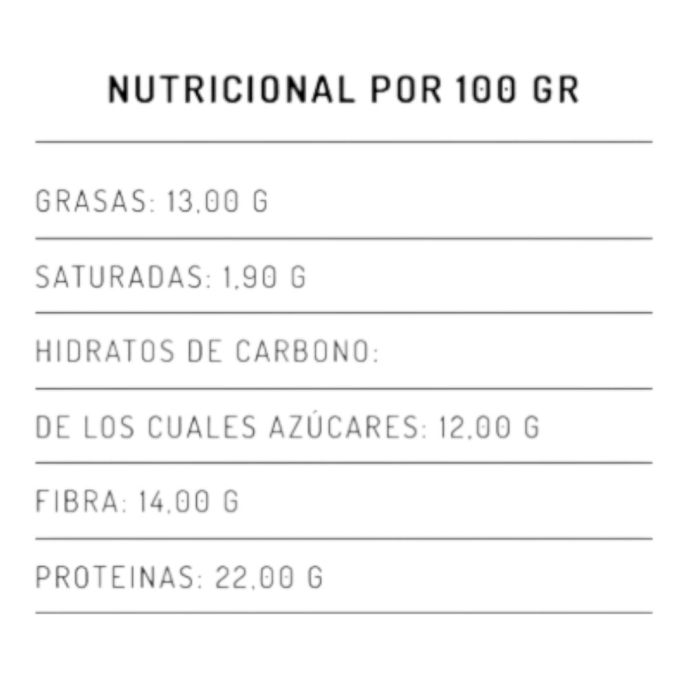 Copos de soja* 35%, copos de trigo integral* 16%, copos de avena integral* 15%, pasas* 15%, copos de trigo integral* tostados 6%, semillas de calabaza*, semillas de girasol*, semillas de chía* (salvia hispánica ), semillas de trigo sarraceno*, semillas de sésamo* 2%, semillas de lino*, aceite de girasol*. Contiene gluten, soja y sésamo. Puede contener frutos de cáscara y leche y sus derivados.