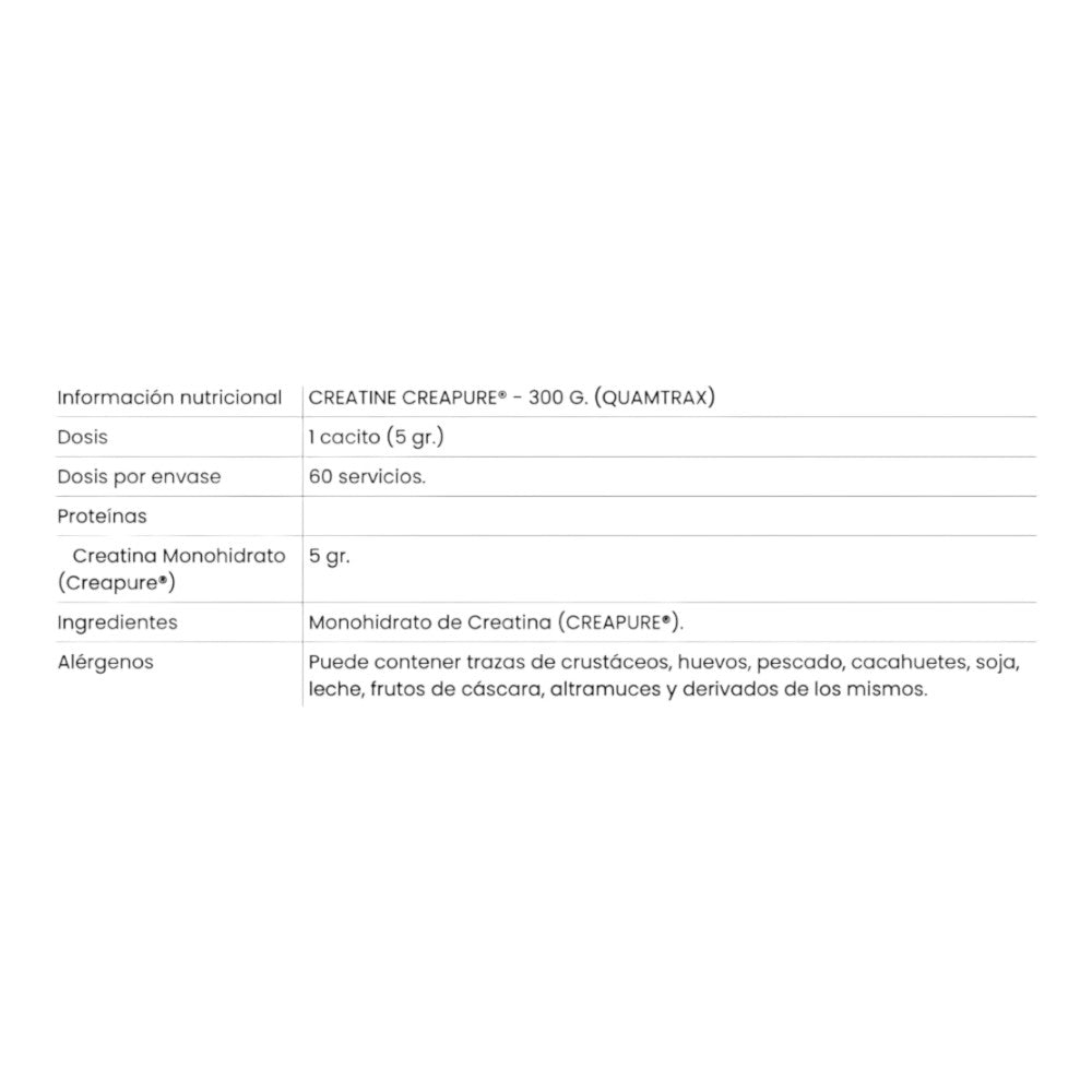La Creatine Creapure 300 Gr es un suplemento deportivo, clasificado como Creatina Monohidrato de Máxima Pureza y Calidad Certificada. Este producto contiene exclusivamente Creatina Monohidrato que lleva la marca registrada Creapure®, reconocida mundialmente por ser la forma más pura de creatina monohidrato disponible en el mercado (producida en Alemania bajo estrictos controles de calidad). Creapure® garantiza que el producto está libre de impurezas y subproductos no deseados como la creatinina o dicianodiamida.
