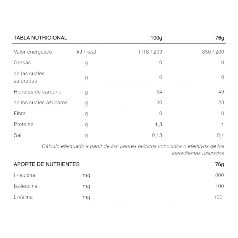 agua, maltodextrina (maltodextrina DE15,  dextrina cíclica altamente ramificada* (Cluster dextrin®), maltodextrina DE6), jarabe de glucosa de maíz, sacarosa, BCAA (L-leucina, isoleucina, L-valina), aroma natural, correctores de acidez (ácido cítrico, citrato de sodio), cloruro de sodio, gelificante (goma gellan), conservador (sorbato de potasio), emulgente (lecitina de girasol).