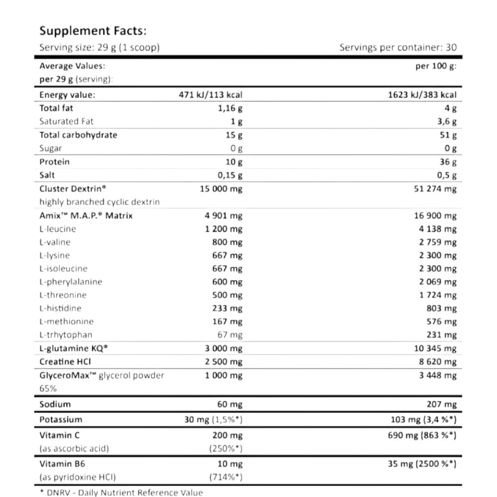 Es una combinación avanzada de dextrina cíclica altamente ramificada (HBCD) Cluster Dextrin®, GlyceroMax ™, creatina HCl, aminoácidos M.A.P.® con L - Glutamina y vitaminas.