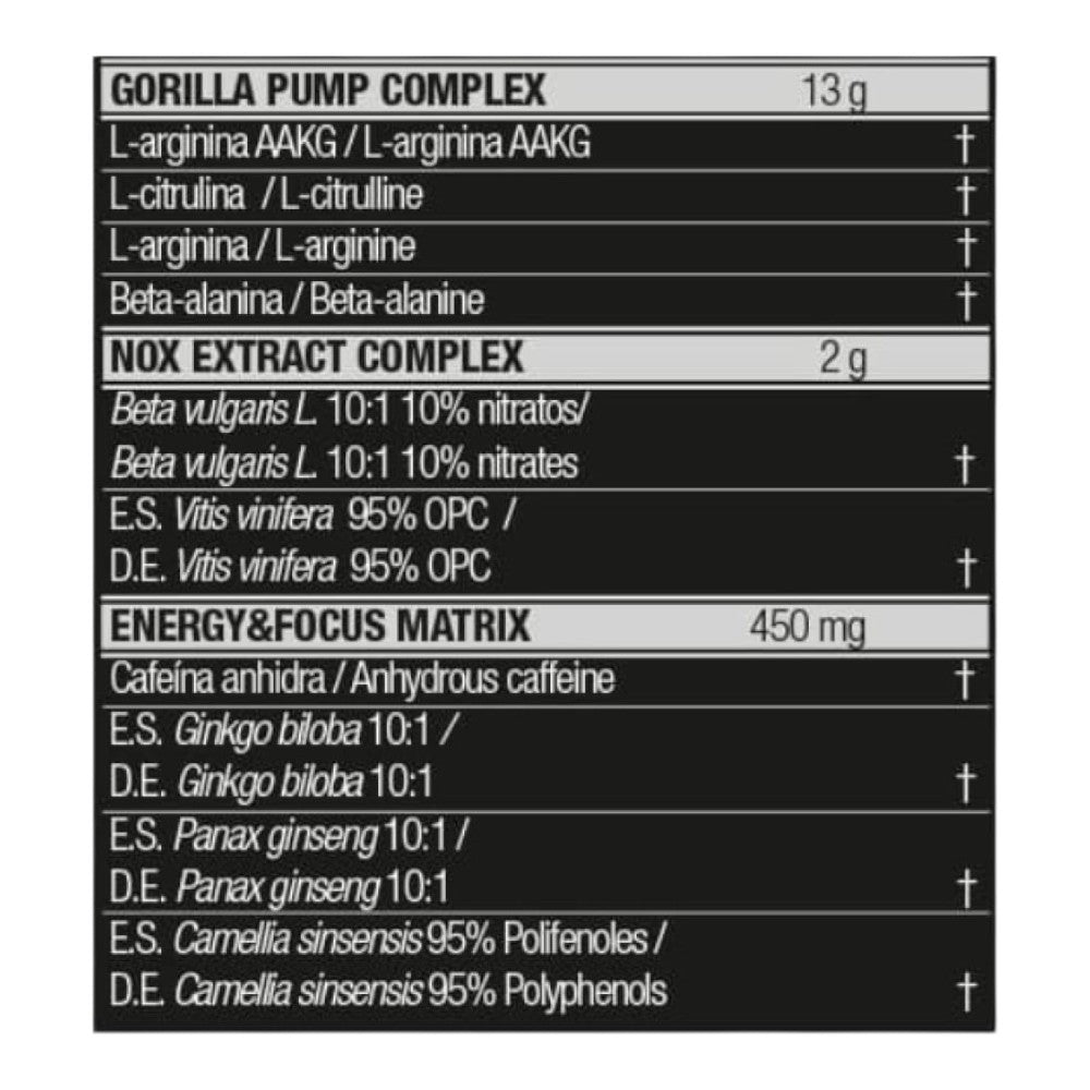 Moonstruck® II contiene “Gorilla Pump” una fórmula de óxido nítrico única y novedosa con extractos vegetales enriquecidos con nitratos de remolacha y uva, que aporta hasta 13 gr de aminoácidos vasodilatadores que hacen que tu sangre corra rápidamente y masivamente a tus músculos, mejorando la tu aspecto lleno y vascularizado en tus entrenos.