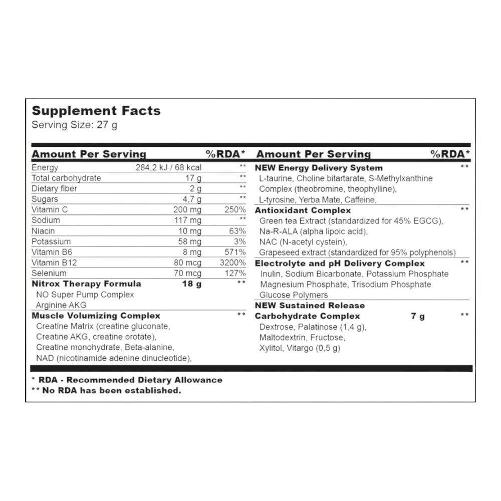 Melocotón: Complex carbohydrate (maltodextrina), NOx NRG PUMP (beta-alanina, clorhidrato de L-arginina, L-citrulina, citrato malato de calcio, L-arginina-alfa-cetoglutarato), acidulante (ácido cítrico), antiaglomerantes (fosfatos de calcio, dióxido de silicio), aromas, Creatine Complex 1,4% [monohidrato de creatina micronizado, monohidrato de creatina tamponado (monohidrato de creatina micronizado, óxido de magnesio), citrato de creatina (monohidrato de creatina micronizado, sales cálcicas de ácido cítrico)], ATP POWER (cafeína 1,2%, ácido nicotínico, ácido alfa-lipoico, monofosfato de adenosina), BCAAs 0,8% (L-leucina, L-isoleucina, L-valina), sal, edulcorante (sucralosa), colorantes (tartrazina1, indigotina), Mineral Blend [sales magnésicas de ácido cítrico, fumarato ferroso, pirofosfato de hierro, óxido de zinc, clorhidrato de piridoxina, cloruro de cromo(III)].1Tartrazina, Rojo Allura AC: Puede tener efectos negativos sobre la actividad y la atención de los niños.