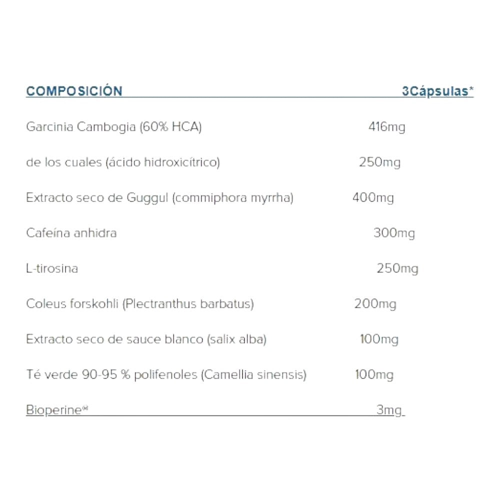 Cafeína Anhidra, Extracto seco de Té Verde (Camellia Sinensis, hojas), Extracto seco de Citrus Aurantium (Fruto), Agente de Carga (Celulosa Microcristalina), L-Carnitina Tartrato, Extracto seco de Pimienta Negra (Piper Nigrum, fruto), Antiaglomerante (Estearato de Magnesio), Cápsula (Gelatina).
