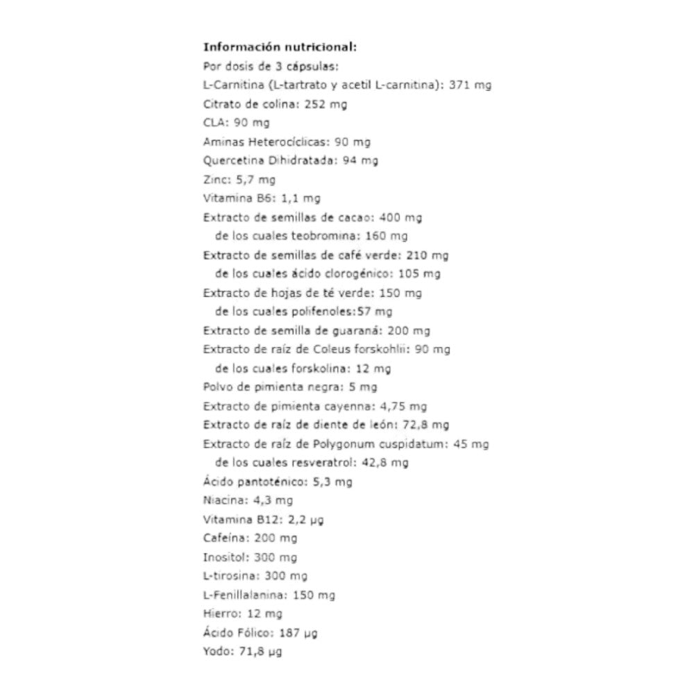 - Extractos de plantas, carnitina, colina, inositol, CLA, HCA, aminoácidos, vitaminas y minerales.