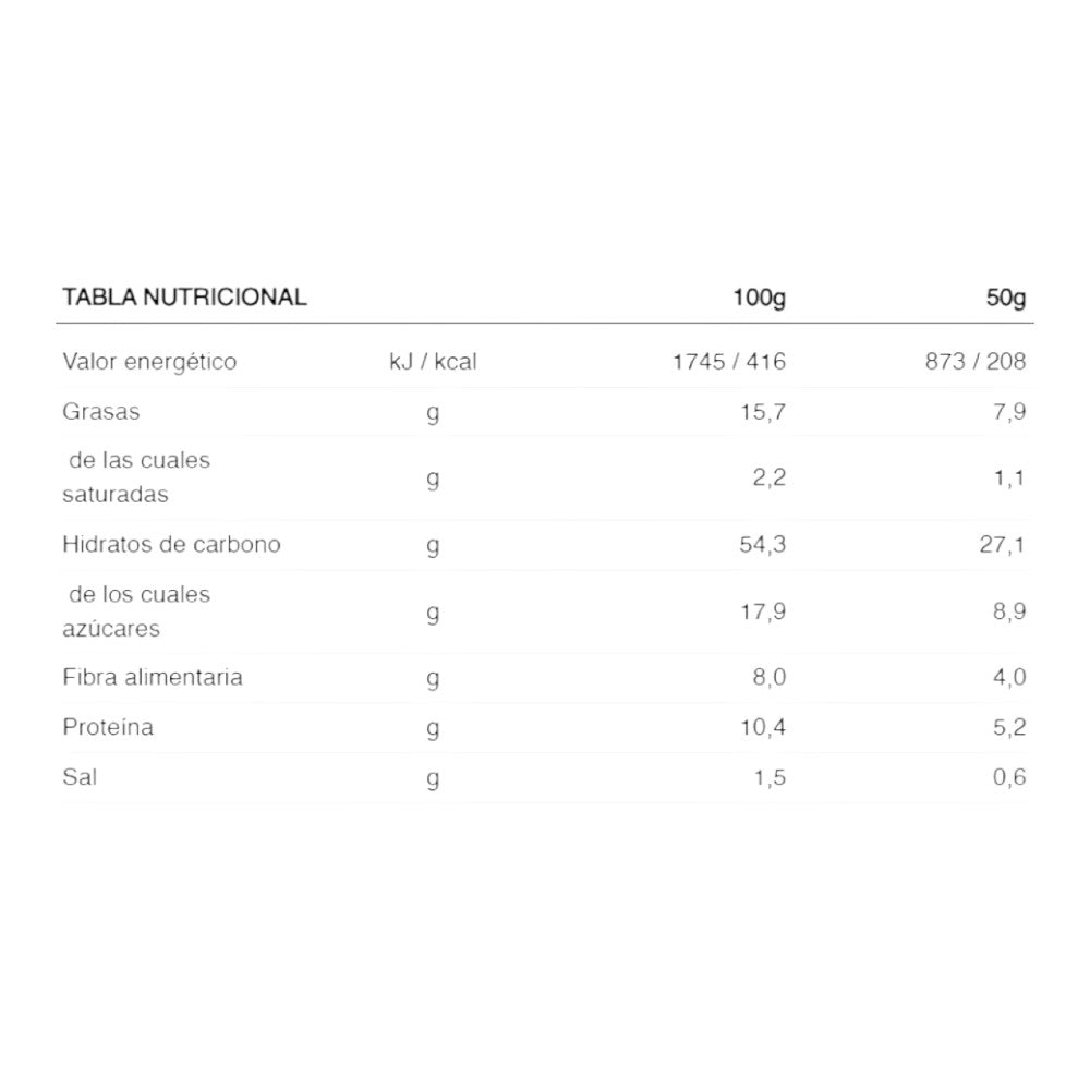 Copos de avena (sin gluten), jarabe de arroz ecológico, pasta de dátil [pasta de dátil, aceite de maíz], pistacho, aceite de oliva virgen extra, semillas de chía (Salvia hispanica), sésamo (Sesamum indicum).