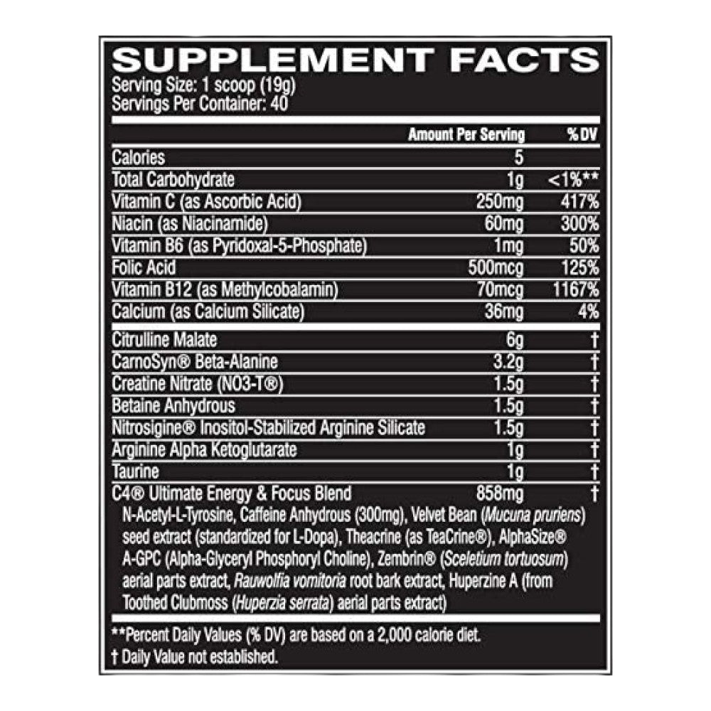 L-citrulina DL malato, CarnoSyn® (beta alanina), creatina monohidrato micronizada, betaína anhidra, Nitrosigine® (silicato de arginina inositol), polidextrosa, arginina alfa cetoglutarato, taurina, agente de carga (dióxido de silicio, fosfato tricálcico), saborizante, N-acetil-L-tirosina, cafeína anhidra, edulcorantes (acesulfame potásico y sucralosa), trisodio citrato, extracto de rhodiola rosea, vitaminas (ácido ascórbico, ácido fólico, nicotinamida, hidrocloruro de piridoxina, metilcobalamina), colorante (betacarotenos), extracto de cacao (Theobroma cacao L.) (estandarizado para teobromina), extracto de panax ginseng.