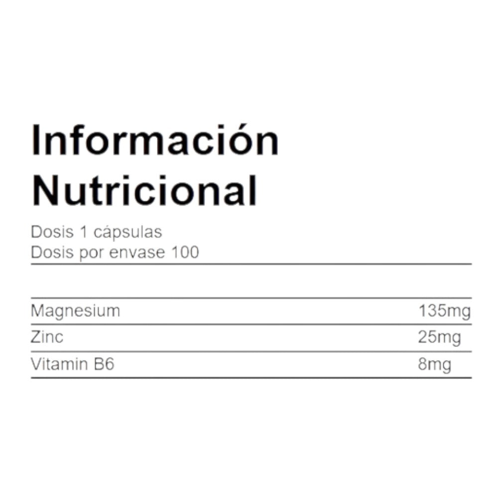 Óxido de Magnesio, antiaglomerante (estearato de magnesio), Gluconato de Zinc, Gelatina (Cápsula vacía) y Vitamina B6 (piridoxina).