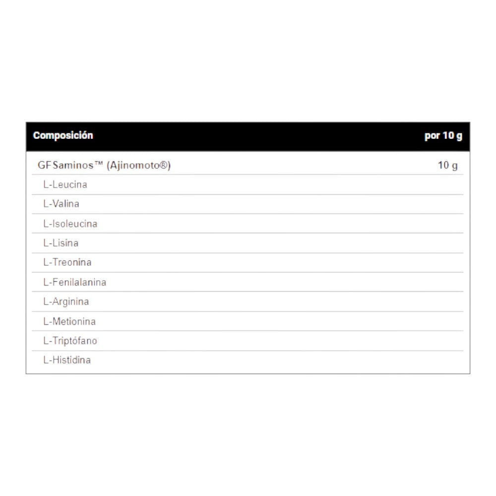 GFS aminos (L-Leucina, L-valina, L-isoleucina, L-lisina, L-fenilalanina, L-treonina, L-arginina, L-metionina, L-histidina, L-triptófano), clorhidrato de piridoxina (vitamina B6), edulcorante (xilitol, eritrilol y sucralosa), aroma de limón, acidificante (ácido cítrico) y colorante amarillo natural curcumina.