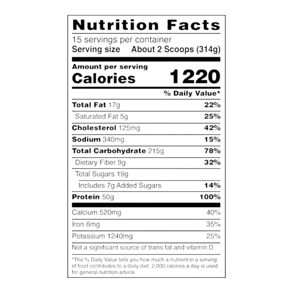 Mezcla de hidratos de carbono (maltodextrina, harina de avena, polidextrosa), mezcla de proteínas (concentrado de proteína de suero, caseinato de calcio, aislado de proteína de leche, aislado de proteína de suero, caseína micelar, aislado de proteína de suero hidrolizada, albúmina de huevo), emulgente (lecitina de soja), aceite de girasol (en polvo), cacao magro en polvo (3,7%), aromas, triglicéridos de cadena media (en polvo), espesantes (goma de celulosa, goma xantana, goma guar, goma arábiga), edulcorantes (acesulfamo K, sucralosa), péptidos de glutamina.