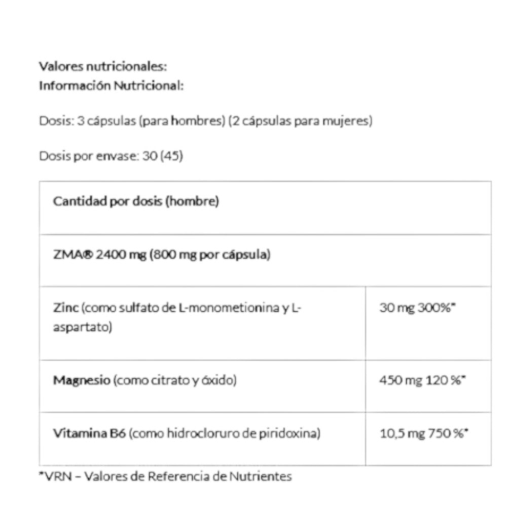 ZMA® es una fórmula mineral única diseñada para favorecer la producción hormonal natural, que combinándola con el ejercicio y una dieta correcta es capaz de elevar los niveles de testosterona alrededor de un 33% lo que favorece el aumento de fuerza y de la masa muscular. Los estudios clínicos llevados a cabo han demostrado que esta mezcla puede ayudar a mejorar los niveles de testosterona saludables, así como la fuerza y potencia muscular.Esto se logra porque el ZMA mejora el ciclo del sueño (prolongando las etapas Nrem 3 y 4 que son las etapas donde el organismo produce sus hormonas masculinas, femeninas y hormonas del crecimiento), logrando un descanso más reparador y una reconstitución muscular más significativa. Desde hace mucho tiempo es conocido el alto poder anabólico de esta mezcla, que puede elevar los niveles de testosterona y de IGF-1, lo que se traduce en una gran ayuda para la hipertrofia muscular y su consiguiente aumento de la fuerza y masa muscular libre de grasa. También actúa como antioxidante, protegiéndonos de los daños causados por los radicales libres.