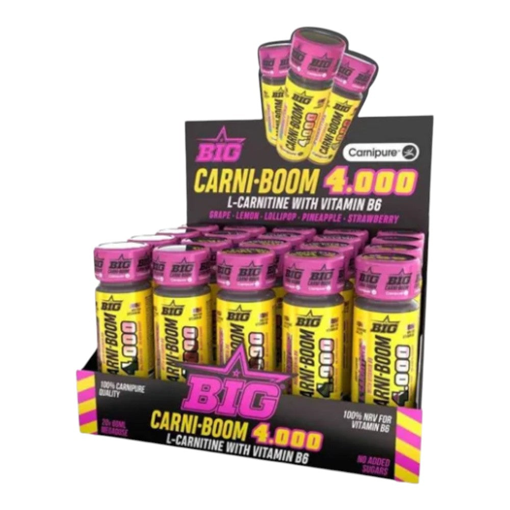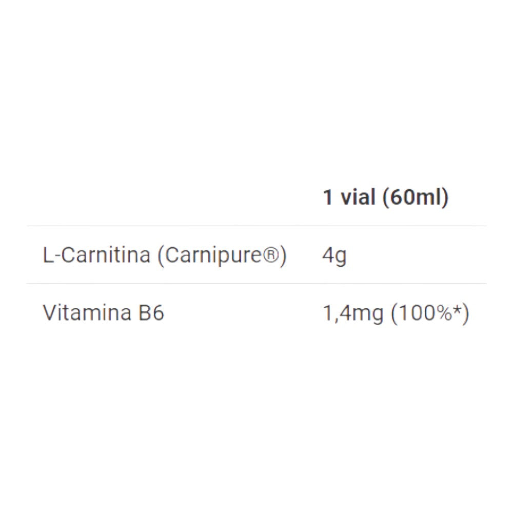 Sabor piruleta: Agua, L-Carnitina (Carnipure®) 6,67%, corrector de acidez (ácido cítrico), aroma, conservadores (E-202, E-211), colorante (E-162), edulcorante (E-955) y vitamina B6 (clorhidrato de piridoxina).