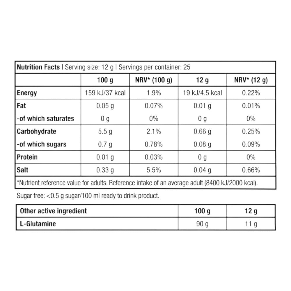 Sabor a limón: L-glutamina (90%), acidulante (ácido cítrico), aromas, corrector de acidez (tartratos de potasio), edulcorantes (sucralosa, glicósidos de esteviol), sal, colorante (tartrazina)*.
