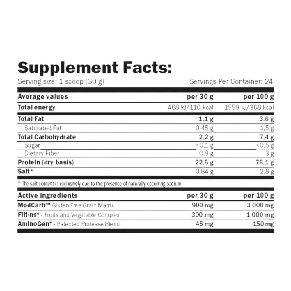 Mezcla proteica vegetal 87% (aislado de proteína de guisante Pisane®, proteína de arroz, proteína de soja); cacao en polvo, ModCarb™ (salvado de avena sin gluten, quinoa, amaranto, alforfón, mijo), extractos y concentrados de frutas y hortalizas Fiit-ns® (extracto de té verde, extracto de guaraná, extractos de uva roja y blanca, extracto de pomelo, extracto de zanahoria negra, nicotinamida), aroma, mezcla patentada de proteasa AminoGen® (maltodextrina, proteasas), edulcorantes: glicósidos de esteviol, sucralosa y acesulfamo-K.