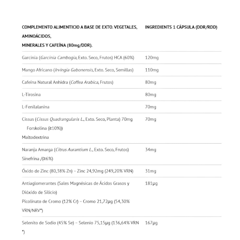 Entre sus ingredientes se encuentran compuestos ampliamente estudiados como la cafeína, extracto de té verde, sinefrina, L-carnitina, tirosina y otros agentes termogénicos que ayudan al cuerpo a movilizar grasas y utilizarlas como fuente de energía. Esto lo convierte en un suplemento ideal para etapas de definición o para quienes buscan un impulso adicional en sus entrenamientos.