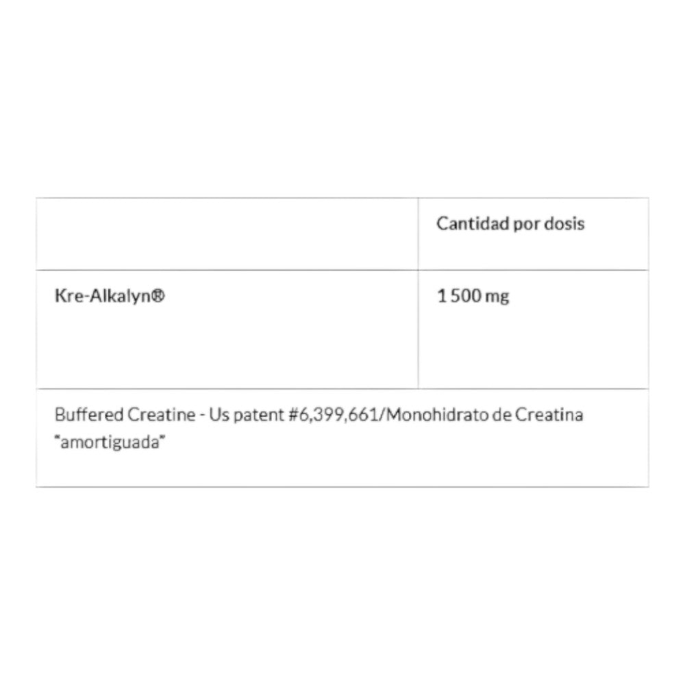 monohidrato de creatina tamponado (Kre-Alkalyn®) 1500 mg , cápsula de gelatina (hecha de gelatina pura, agua), agentes antiaglomerantes: estearato de magnesio, dióxido de silicio.