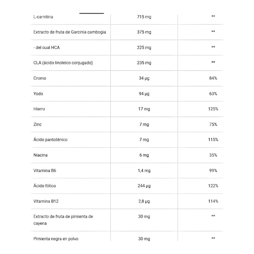 L-carnitina-L-tartrato 42%, CLA en polvo [glicéridos (rico en CLA), jarabe de maíz deshidratado, caseinato de sodio (contiene leche), antiaglomerante (dióxido de silicio), esta- bilizante (fosfatos de potasio)] 16%, extracto de fruta de Garcinia cambogia 16%, cubierta de la cápsula [gelatina, agente de recubrimiento (goma laca), colorante (óxidos e hidróxidos de hierro), corrector de la acidez (hidróxido de amonio), corrector de la acidez (hidróxido de potasio)], antiaglo- merantes (sales magnésicas de ácidos grasos, dióxido de silicio), fumarato ferroso, acetil-L-carnitina 1,2%, extracto de fruta de pimienta de cayena (Capsicum annum), fruta de pimienta negra (Piper nigrum) en polvo, óxido de zinc, D-pantotenato cálcico, ácido nicotínico, clorhidrato de piridoxina, cianocobalamina, ácido pteroilmonoglutámico , cloruro de cromo III, yoduro de potasio.