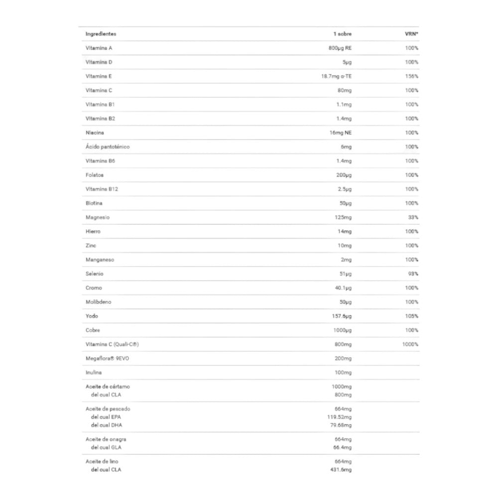 Ingredientes cápsula probióticos Megaflora® 9evo: Maltodextrina, Complejo de probióticos Megaflora® 9 EVO (Almidón de maíz, Maltodextrina de maíz, Fructo-oligosacáridos, Inulina, Dextrina de maíz, Cloruro potásico, Proteína vegetal hidrolizada, Sulfato de magnesio, Cepas bacterianas (Bifidobacterium lactis W51 y W52, Enterococcus faecium W54, Lactobacillus acidophilus W22, Lactobacillus paracasei W20, Lactobacillus plantarum W1 y W21, Lactobacillus salivarius W24, Lactococcus lactis W19), Amilasa, Aroma de vainilla en polvo, Sulfato de manganeso), Espesante (Polidextrosa), Inulina (Procedente de la raíz de Achicoria (Cichorium intybus L.)), Antiaglomerantes (Sales magnésicas de ácidos grasos, Dióxido de silicio), Cápsula (Agente de recubrimiento (Hidroxipropilmetilcelulosa), Colorante (Complejos cúpricos de clorofilas y clorofilinas)).
