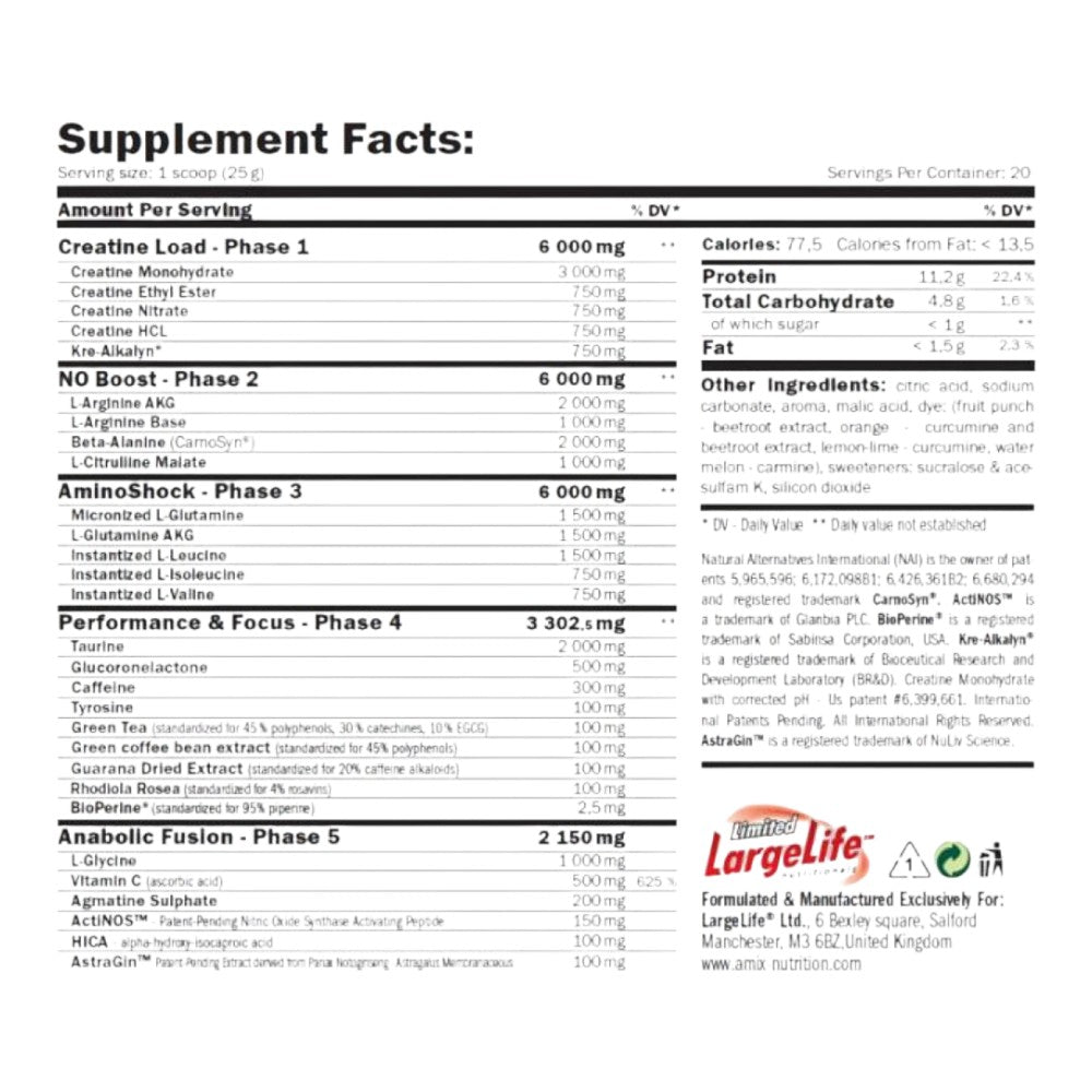 Monohidrato de creatina, L-Arginina AKG, beta-alanina (CarnoSyn®), taurina, L-glutamina, L-Glutamina AKG, L-leucina, L-arginina HCL, malato-L citrulina, L-glicina, éster etílico de creatina, creatina nitrato, creatina HCl, creatina Kre-Alkalyn®, L-isoleucina, L-valina, glucuronolactona, ácido ascórbico (vitamina C), regulador la acidez : ácido cítrico, cafeína anhidra, colorante: (ponche de frutas - extracto de remolacha, naranja - curcumina y extracto de remolacha, limón y lima - curcumina, melón de agua - carmín), inosina, ActiNOS™ - péptidos y proteínas bioactivos enriquecidos selectivamente a partir de suero de leche, tirosina, extracto de té verde (estandarizado para 45% de polifenoles, 30% de catequinas, 10% EGCG), extracto de grano de café verde (estandarizado para un 45% de polifenoles), extracto seco de guaraná (estandarizado para 20% de alcaloides de cafeína), rhodiola rosea, HICA - ácido alfa-hidroxi-isocaproico, reguladores acidificantes: carbonato de sodio, ácido málico; AstraGin™ extracto pendiente de patente derivado de Panax Notoginseng - astrágalo membranaceous), aroma, edulcorantes: sucralosa y acesulfamo-K, antiaglomerante: dióxido de silicio.