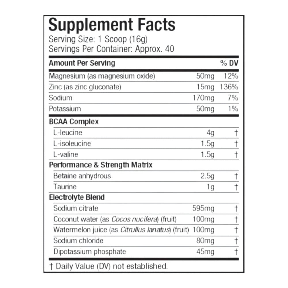 Complejo de BCAAs (L-leucina, L-isoleucina, L-valina), Matriz de redimiento y fuerza (Betaína anhidra, Taurina), Mezcla de electrolitos (citrato de sodio, agua de coco (como Cocos nucifera) (fruta), zumo de sandía (como Citrullus lanatus) (fruta), clolruro de sodio, fosfato dipotasio).