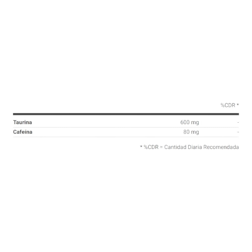 Taurina 70,7%, cubierta de la cápsula [gelatina, agente de recubrimiento (goma laca), colorante (óxidos e hidróxidos dehierro), corrector de la acidez (hidróxido de amonio), corrector de la acidez (hidróxido de potasio)], cafeína 9,4%,maltodextrina.