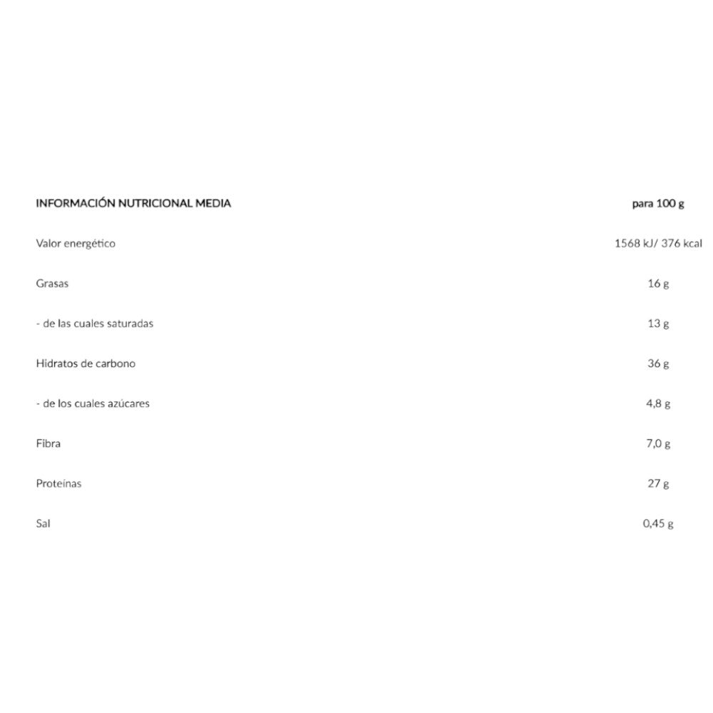 Humectantes (maltitoles, glicerina), cobertura de cacao [edulcorantes (maltitoles), aceites vegetales totalmente hidrogenados (coco, colza), cacao en polvo bajo en grasa, emulgentes (lecitinas)] 15%, trozos de galleta [harina de arroz, azúcar, almidón de maíz, aceite de coco refinado, cacao en polvo bajo en grasa, jarabe de glucosa, sal, espesante (goma guar), gasificantes (hidrogenocarbonato de amonio, hidrogenocarbonato de sodio), aroma] 10%, concentrado de proteínas de suero de leche, concentrado de proteínas de leche, fructo-oligosacáridos, colágeno hidrolizado, aceite de coco totalmente refinado, aislado de proteínas de suero de leche instantáneo {aislado de proteína de suero de leche, emulgente [lecitinas (soja)]}, agua, harina de almendra, emulgente [lecitinas (soja)], aromas, gelificante (carragenina), conservante (sorbato de potasio), estabilizante (cloruro de potasio), antioxidante (alfa-tocoferol), edulcorante (sucralosa).
