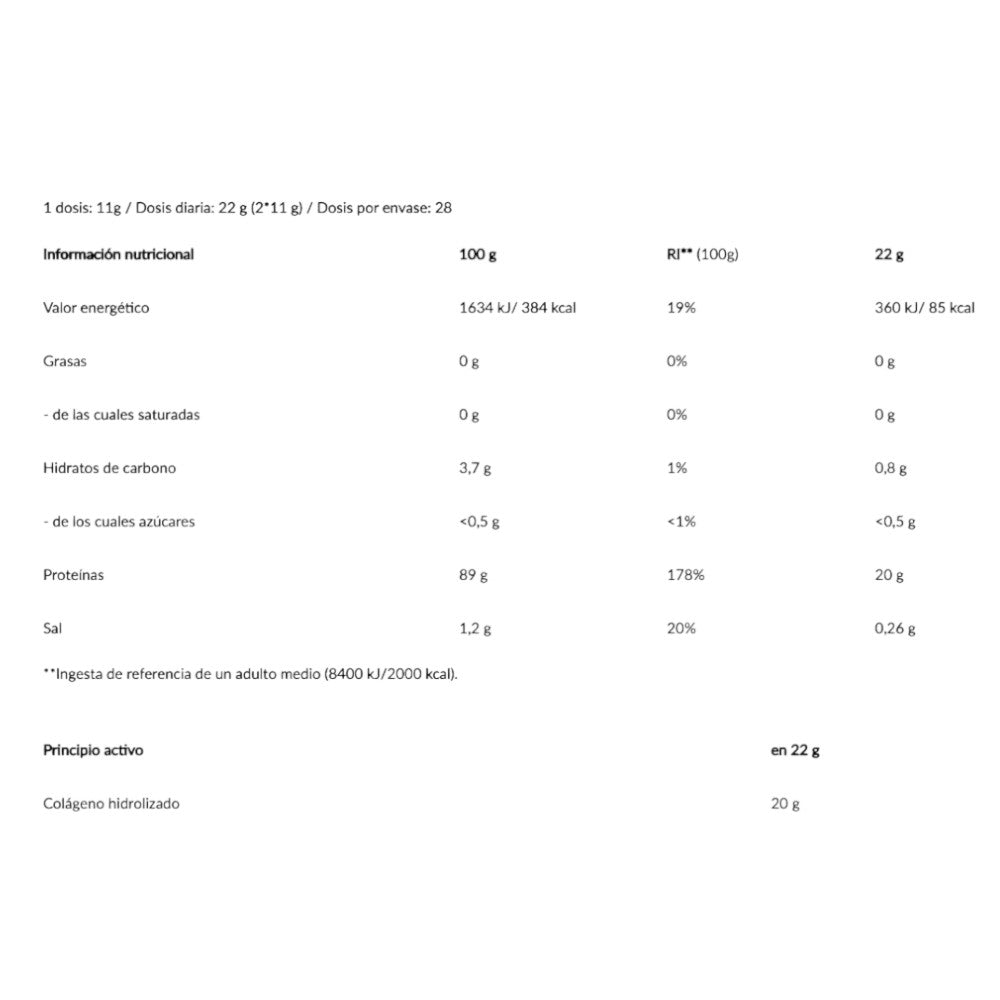 - Gracias a su contenido de 91% de colágeno hidrolizado, cada porción diaria (22 g) de bebida en polvo Clear Collagen aporta al organismo 20 g de colágeno al día bajo forma de bebida refrescante. El colágeno es una proteína clave que se encuentra en nuestros tejidos conjuntivos y en la piel. El colágeno es producido por el organismo, pero a medida que envejecemos merece la pena apoyar su producción a partir de fuentes externas mediante el consumo de productos ricos en colágeno de buena calidad.
