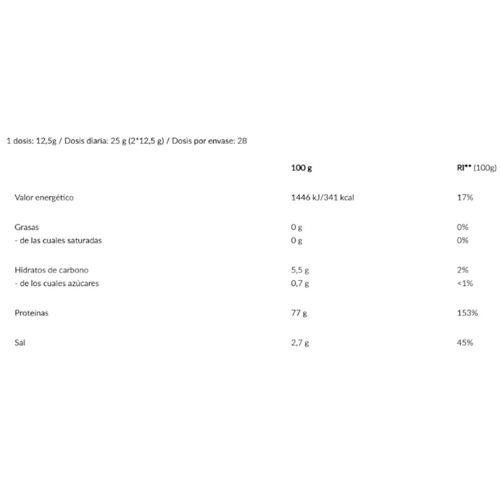 Colágeno hidrolizado 80%, aromas, acidulante (ácido cítrico) agente de carga (polidextrosa) concentrado de betabel en polvo [maltodextrina, concentrado de betabel, acidulante (ácido cítrico)], cartílago hidrolizado en polvo ChondrActiv® 2,0%, ácido L-ascórbico, clorhidrato de L-lisina 0,5%, ácido hialurónico 0,4%, glicina 0,4%, L-prolina 0,4%, antiaglomerante (dióxido de silicio), edulcorante (sucralosa), luteína (de extracto de flor de Calendula officinalis) bisglicinato de cinc, colorante (carotenos), sal, preparado de acetato de DL-alfa-tocoferilo [acetato de DL-alfa-tocoferilo, antiaglomerante (dióxido de silicio)], selenito de sodio, ácido nicotínico, gluconato de cobre, preparado de acetato de retinilo [estabilizante (goma arábiga), acetato de retinilo, antioxidante (alfa-Tocoferol), antiaglomerante (fosfatos de calcio)], D-pantotenato cálcico, colecalciferol, clorhidrato de piridoxina, preparado de riboflavina [riboflavina, agente de carga (hidroxipropilmetilcelulosa)], mononitrato de tiamina, L-metilfolato cálcico, cianocobalamina, D-biotina.