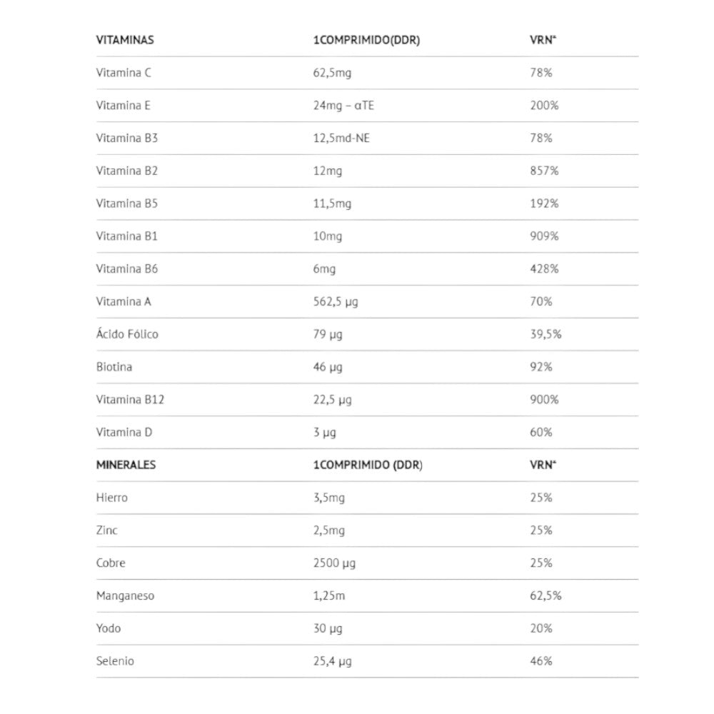 Incluye vitaminas del grupo B para favorecer la producción de energía, vitamina C y D para reforzar las defensas, y minerales clave como zinc, magnesio y selenio que participan en la función cognitiva, muscular y antioxidante. Su formato en comprimidos facilita la toma diaria y asegura un aporte óptimo incluso en personas con dietas exigentes o ritmos intensos de actividad.